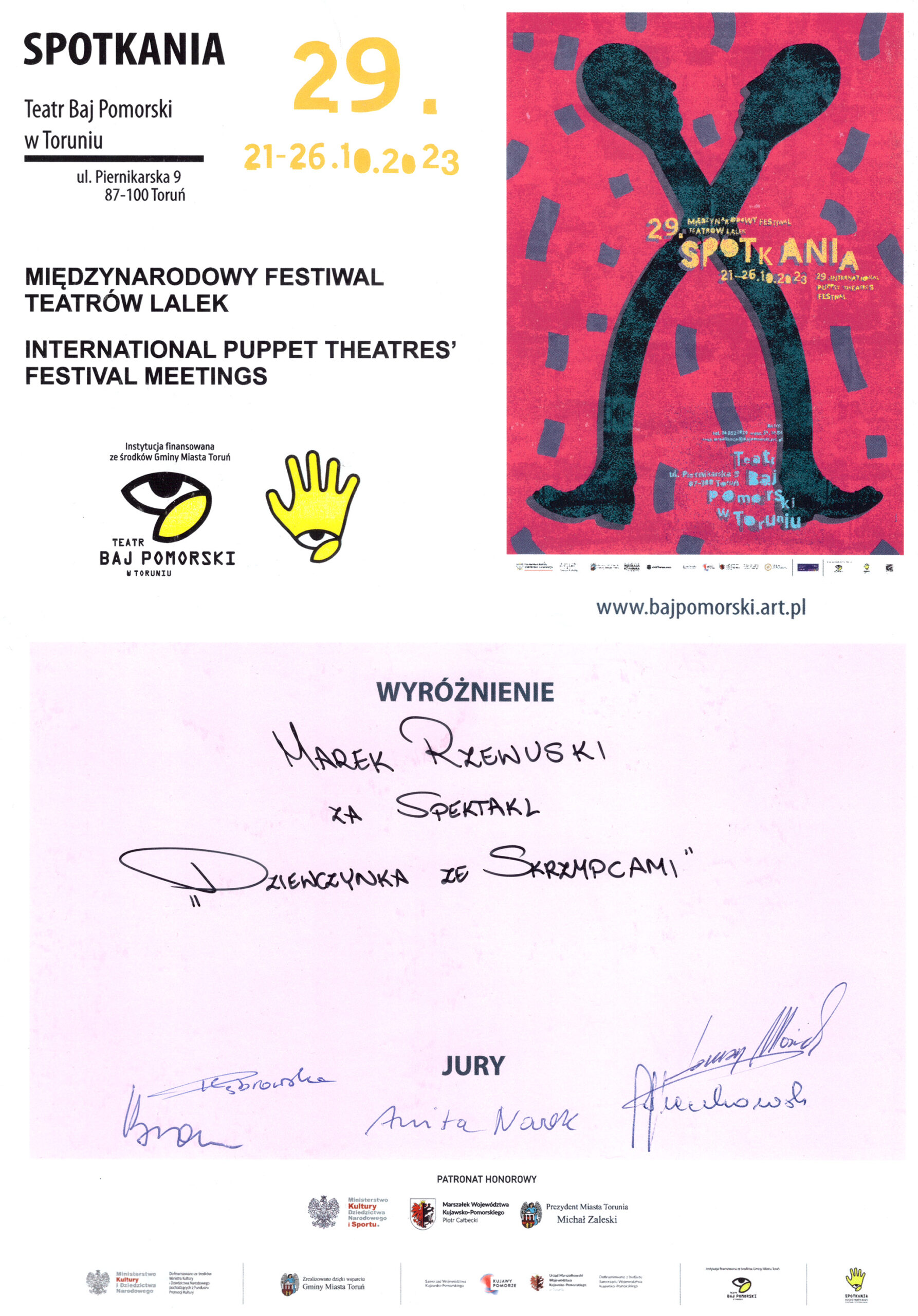 - I det 29. Grand Prix på International Puppet Theatres’ Festival Meetings „Spotkania” lot juryen imponere av mitt bidrag i prosjektet og jeg ble tildelt diplom. Bidraget mitt kunne ikke vært mulig uten nært samarbeid og inspirasjon fra stykkets scenograf.